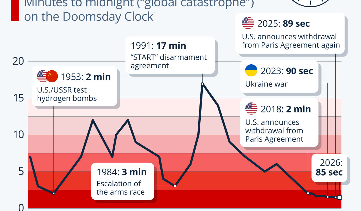 As Statista’s Anna Fleck reports, according to the Bulletin of the Atomic Scientists, the decision to move the clock forward from 89 to 85 seconds reflects escalating threats from nuclear weapons, accelerating climate change and the potential misuse of emerging technologies.