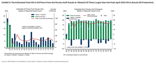 Still very low Persian Gulf oil flows. The estimated total hit to oil flows from the Persian Gulf after accounting for pipeline redirection increased to 17.6mb/d (4-day moving average, Exhibit 5) with oil flows through the Strait 97% below normal levels (at 0.6mb/d) and net pipeline redirection via the Yanbu and Fujairah ports slowing to 1.8mb/d (4-day moving average, Exhibit 25).
