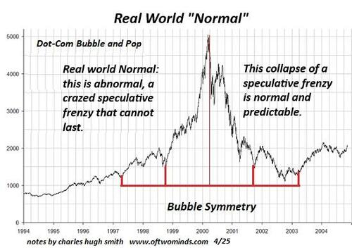 But self-liquidating systems are not permanent. Their internal dynamics guarantee the end-game is extinguishment. Here is a projection of the Everything Bubble based on bubble symmetry and scale invariance: what goes up will come down on a similar trajectory.