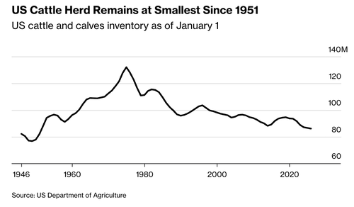 Bloomberg data shows the total US cattle herd size nears a 75-year low.