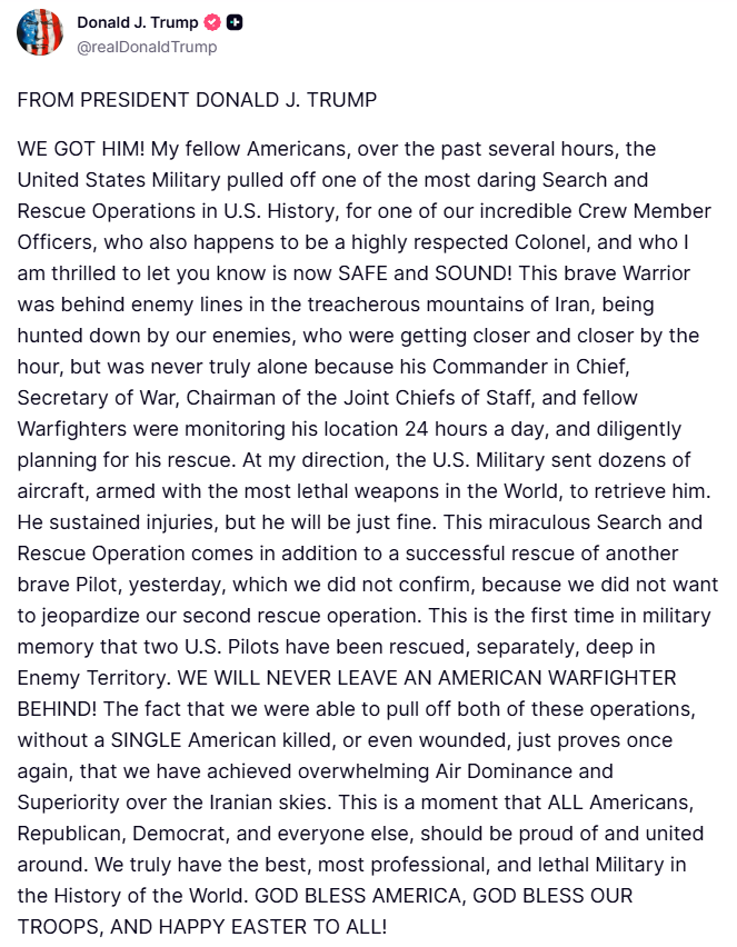 “WE GOT HIM!”: Trump Says As 2nd Downed Pilot Recovered In High Risk Iran Special Forces Raid After ‘Dicey’ Firefight